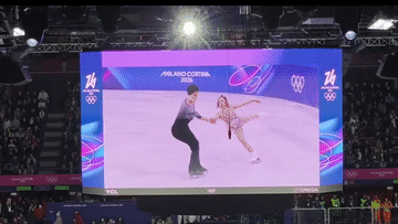米兰冬奥会花样滑冰赛场的大屏幕上,时间切片技术展示运动员的运动轨迹。