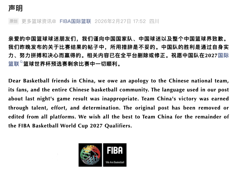 声明说:“我们昨晚发布的关于比赛结果的帖子中,所用措辞是不妥的。中国队的胜利是通过自身实力、努力拼搏和决心而赢得的。相关内容已在全平台删除或修正。祝愿中国队在2027国际篮联篮球世界杯预选赛剩余比赛中一切顺利。”