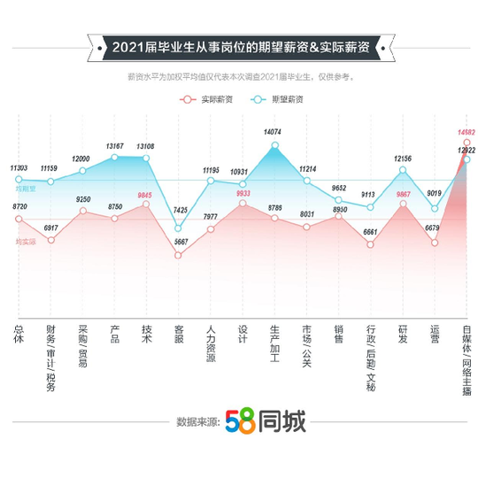 根据58同城《2021年高校毕业生就业报告》显示,薪资待遇与个人发展是毕业生择业的关注重点。在薪资方面,毕业生平均税前月薪8720元,IT/通信/电子/互联网行业的税前薪资水平最高,为10815元;其次是金融行业,为9833元,均在平均月薪之上。这表明,专业性强的行业能者居之,不可替代性较高,因此薪资水平位列前茅。从岗位情况来看,传统职业中,设计、研发、技术岗税前薪资排名前三,分别为9933元、9867元、9845元;作为新兴职业,自媒体/网络主播税前薪资最高,为14682元,超出了毕业生对该岗位的期望薪资。整体来看,技术含量高的岗位薪资普遍较高,而随着直播、短视频的蓬勃发展,新兴职业待遇“水涨船高”。