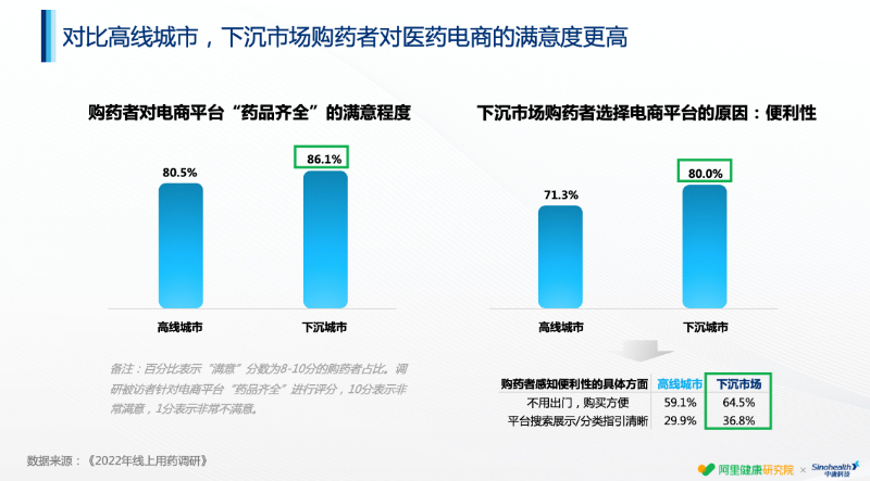 《白皮书》显示,2019年到2021年下沉市场用户数持续增长,其中2021年增速接近四成,超过高线城市的增速。同时,八成以上的下沉市场患者选择线上购药,是因为线上品类齐全,购买方便。
