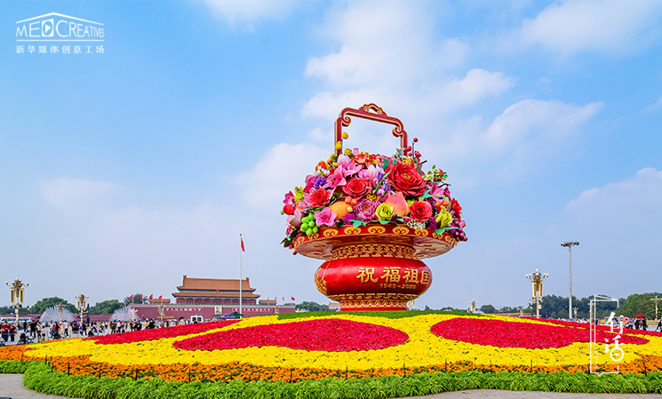 我們在天安門廣場中心布置了“祝福祖國”的巨型花果籃?;@內(nèi)的一千朵花、一百只果匯聚成一句話就是:祝福祖國繁榮昌盛,祝福人民幸福安康。底花壇的十個(gè)紅心圖案象征著全國人民心心相印,團(tuán)結(jié)一致,為實(shí)現(xiàn)中華民族偉大復(fù)興的“中國夢”而努力奮斗。
