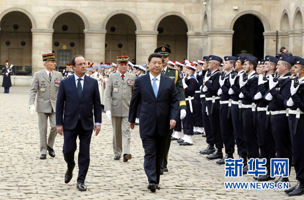 ????會(huì)談前,奧朗德在榮軍院廣場(chǎng)為習(xí)近平舉行隆重歡迎儀式。當(dāng)習(xí)近平和夫人彭麗媛抵達(dá)時(shí),受到奧朗德熱情迎接。在嘹亮的進(jìn)行曲中,兩國(guó)元首步入廣場(chǎng)。軍樂(lè)隊(duì)高奏中法兩國(guó)國(guó)歌。兩國(guó)元首檢閱共和國(guó)衛(wèi)隊(duì)和三軍儀仗隊(duì)。隨后,兩國(guó)元首來(lái)到廣場(chǎng)中央,觀看分列式。習(xí)近平向奧朗德介紹中方主要官員,并同法方主要官員握手問(wèn)候。