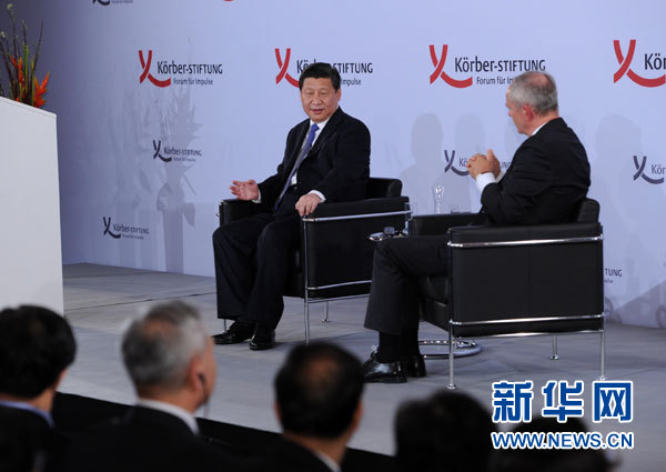 ??? 這是演講結(jié)束后習(xí)近平主席回答科爾伯基金會(huì)常務(wù)副主席魏邁爾的提問(wèn)。新華社記者 饒愛(ài)民 攝