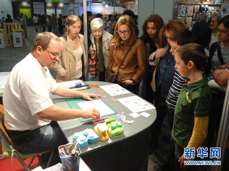 ????4月26日,巴塞羅那第一屆“手工藝品節(jié)”(Handmade Festival Barcelona)上,一些參展者向游客介紹如何進(jìn)行手工制作。
