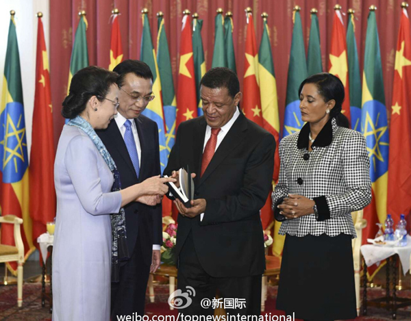 ??? 新華網(wǎng)北京5月6日電? 據(jù)新華社“新國際”微博報道,李克強總理與夫人程虹當?shù)貢r間6日上午同埃塞總統(tǒng)穆拉圖夫婦在國家宮會見。會見后,程虹將自己的著作和譯著贈送給穆拉圖總統(tǒng)夫婦。