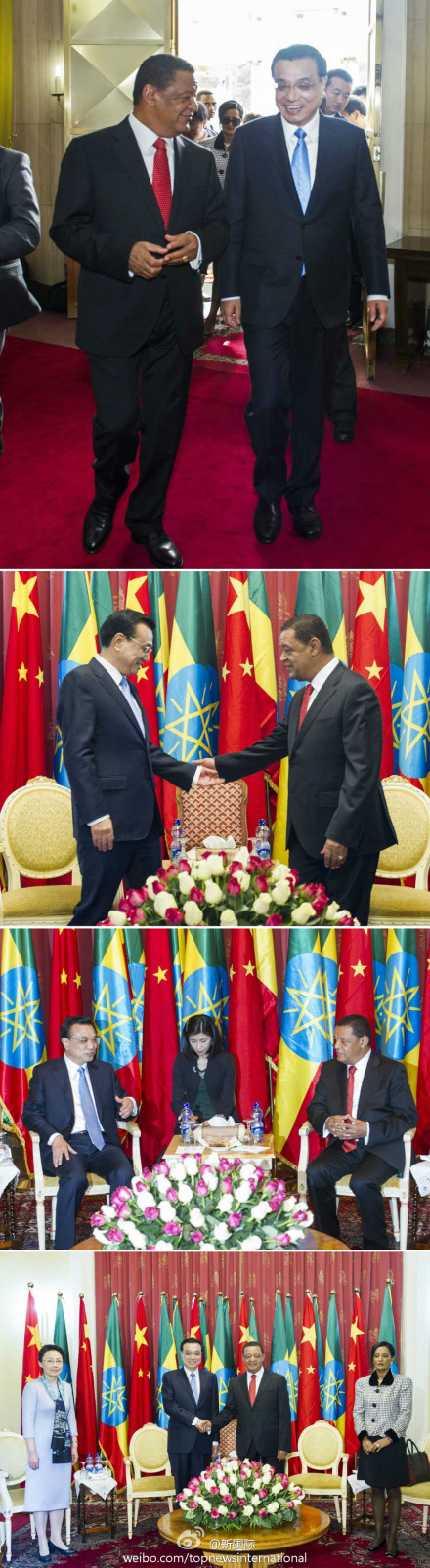 ??? 李克強與夫人程虹6日與埃塞俄比亞總統(tǒng)穆拉圖夫婦在總統(tǒng)官邸國家宮會見。李克強說,我們校友見面格外親切!總統(tǒng)先生在中國學習工作多年,為中埃、中非關系的發(fā)展作出了重要貢獻。穆拉圖總統(tǒng)曾在北京大學學習十余年,是李克強總理的校友,也是“中國通”。