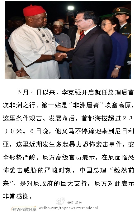 ????新華網(wǎng)北京5月7日電 據(jù)新華社“新國際”微博報(bào)道,5月4日,李克強(qiáng)開啟就任總理后首次非洲之行。繼首站訪問條件艱苦、發(fā)展落后的“非洲屋脊”埃塞高原后,6日晚,他又馬不停蹄地來到面臨恐怖襲擊威脅的尼日利亞。尼方高級官員表示,中國總理“毅然前來”,是對尼政府的巨大支持,尼方對此表示非常感謝。