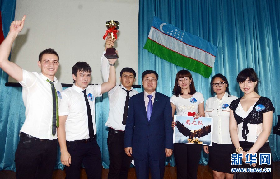 ??? 6月9日,烏茲別克斯坦首都塔什干的烏世界語言大學(xué)禮堂,中國駐烏茲別克斯坦使館孫立杰大使在向獲得冠軍的鷹之隊(duì)頒獎(jiǎng)并合影留念。。