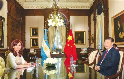 7月18日,國家主席習(xí)近平在布宜諾斯艾利斯同阿根廷總統(tǒng)克里斯蒂娜舉行會談,兩國元首就中阿關(guān)系及共同關(guān)心的問題深入交換意見,達(dá)成重要共識,一致決定將中阿關(guān)系提升為全面戰(zhàn)略伙伴關(guān)系,堅定把對方視為重要發(fā)展機遇和發(fā)展伙伴,加強互利合作和戰(zhàn)略協(xié)作,造福兩國和兩國人民,增強新興市場國家和發(fā)展中國家團(tuán)結(jié)合作。