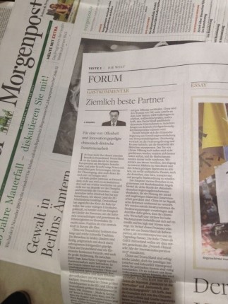 柏林市中心亞歷山大地鐵站的書報(bào)店里,洛塔爾·沙爾夫拿起一份報(bào)紙遞給我們:“今天的《世界報(bào)》上有你們總理發(fā)表的文章?!?/p>