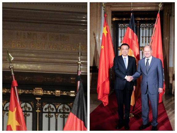 市政廳里,站在代表中國、德國和漢堡的三面旗幟前,克強總理與肖爾茨市長的手緊緊相握。在他們的身后,大門門楣上鐫刻著這樣一句話“hand in hand”。