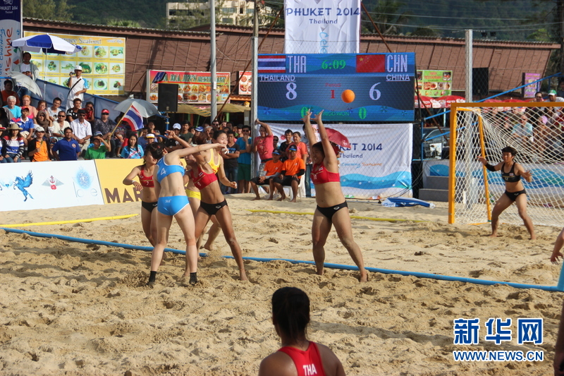 ??? 11月16日,中國沙灘手球運動員宮艷(左二)在比賽中擲球瞬間。中國體育代表團16日在泰國普吉舉行的第四屆亞洲沙灘運動會上勇奪2枚金牌和2枚銅牌。當天比賽全部結束時,中國隊以3金2銀5銅的成績暫列獎牌榜第五。新華社發(fā)(塔納攝)
