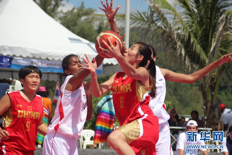 ??? 11月16日,中國沙灘籃球運動員房玲玲(左三)與安靜(左一)在比賽中。中國體育代表團16日在泰國普吉舉行的第四屆亞洲沙灘運動會上勇奪2枚金牌和2枚銅牌。當(dāng)天比賽全部結(jié)束時,中國隊以3金2銀5銅的成績暫列獎牌榜第五。新華社發(fā)(塔納攝)