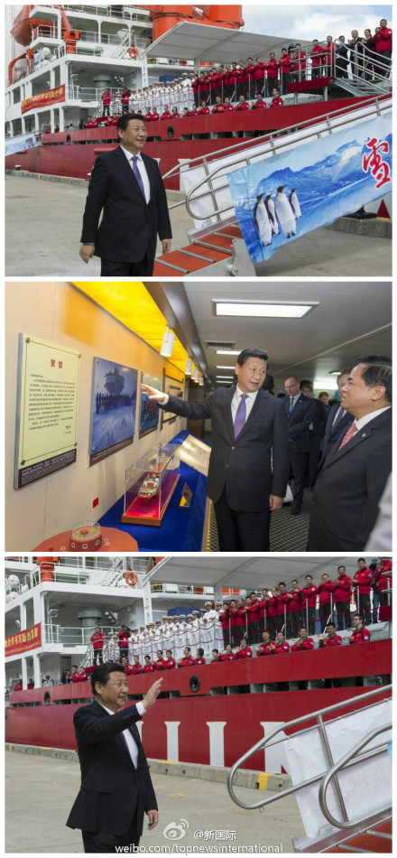 ??? 習(xí)近平攀舷梯,進(jìn)船艙,參觀了極地考察30周年圖片展。在今年建成的南極泰山站模型前,他連著問(wèn):“站里多少人?”“現(xiàn)在南極是白天?”“能看電視嗎?”