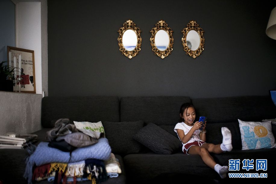 ????Jana坐在家里的沙發(fā)上玩養(yǎng)母Thais的智能手機。新華社巴塞羅那分社攝影師Pau Barrena 攝