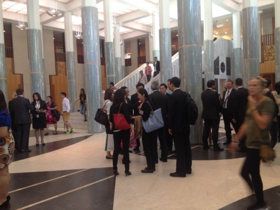 ????這次在澳大利亞,“掌聲響起來(lái)”的地方,是堪培拉的標(biāo)志性建筑——澳聯(lián)邦參眾兩院所在議會(huì)大廈的眾議院會(huì)議廳。演講的聽(tīng)眾?自然主要是議員先生和女士們啦,還有陪同出席演講的阿博特總理、帕里參議長(zhǎng)、工黨領(lǐng)袖肖滕,以及主持人畢曉普眾議長(zhǎng)。