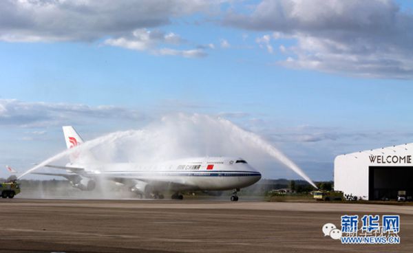 ???? ?11月21日,國(guó)家主席習(xí)近平抵達(dá)楠迪,開(kāi)始對(duì)斐濟(jì)進(jìn)行國(guó)事訪問(wèn)并將同太平洋建交島國(guó)領(lǐng)導(dǎo)人舉行會(huì)晤。圖為習(xí)近平乘坐的專機(jī)在楠迪國(guó)際機(jī)場(chǎng)跑道上滑行穿過(guò)“水門”,這是當(dāng)?shù)亟o予最尊貴客人的禮遇,表達(dá)為客人“洗塵”。 新華社記者 丁林 攝