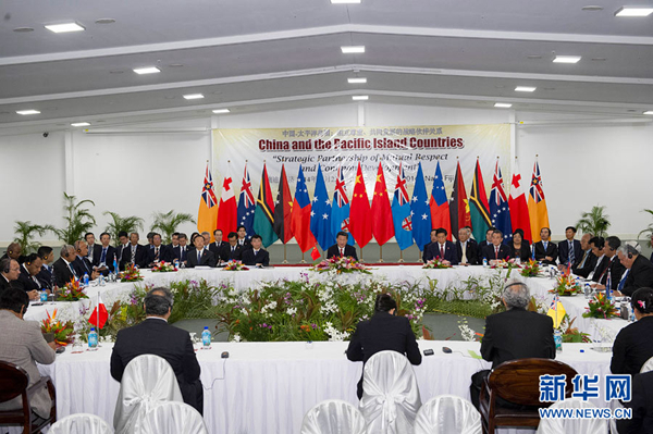 ???? 11月22日,國(guó)家主席習(xí)近平在楠迪同斐濟(jì)總理姆拜尼馬拉馬、密克羅尼西亞聯(lián)邦總統(tǒng)莫里、薩摩亞總理圖伊拉埃帕、巴布亞新幾內(nèi)亞總理奧尼爾、瓦努阿圖總理納圖曼、庫(kù)克群島總理普納、湯加首相圖伊瓦卡諾、紐埃總理塔拉吉等太平洋島國(guó)領(lǐng)導(dǎo)人舉行集體會(huì)晤。習(xí)近平主持會(huì)議并發(fā)表主旨講話(huà)。新華社記者 饒愛(ài)民攝