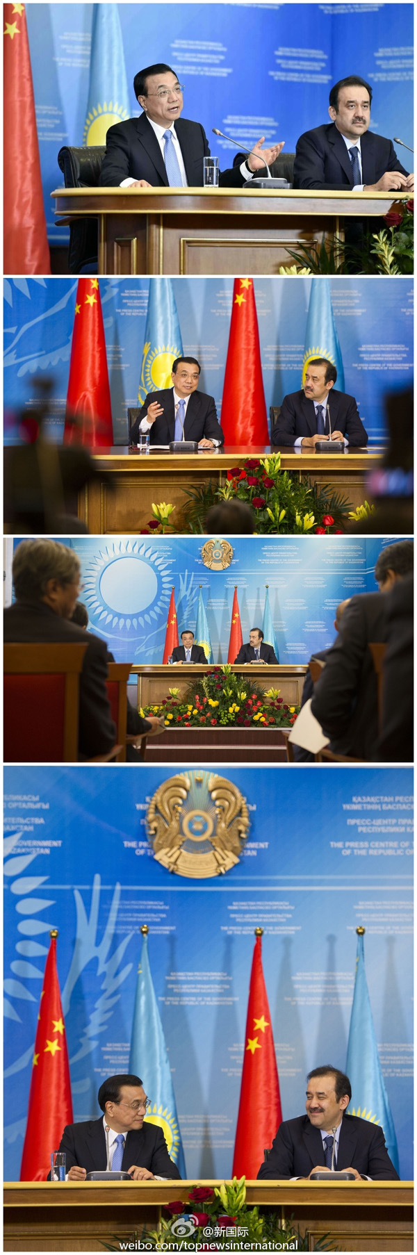 ????新華網(wǎng)北京12月15日電? 據(jù)新華社“新國(guó)際”微博報(bào)道,正在哈薩克斯坦進(jìn)行正式訪(fǎng)問(wèn)的李克強(qiáng)總理14日下午在阿斯塔納與哈總理馬西莫夫舉行會(huì)晤后共見(jiàn)記者。李克強(qiáng)說(shuō),冬天的阿斯塔納氣候寒冷,但中哈合作的溫度在不斷增加,使我們像身處春天一樣,我對(duì)中哈合作充滿(mǎn)信心,祝愿中哈合作繁花似錦。
