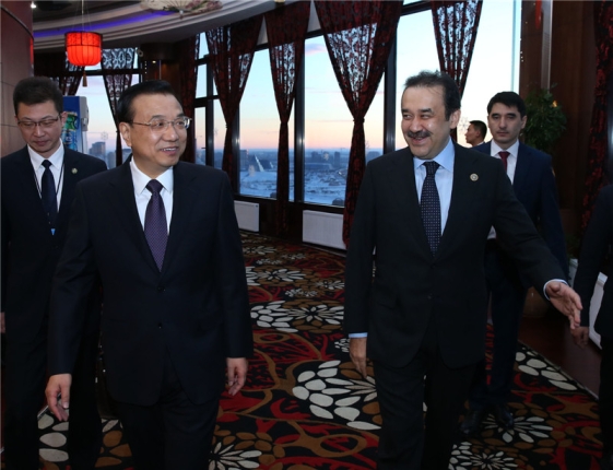 ????(納扎爾巴耶夫總統(tǒng)在集體會(huì)見(jiàn)上合組織成員國(guó)總理、秘書長(zhǎng)和地區(qū)反恐機(jī)構(gòu)執(zhí)委會(huì)主任時(shí),與克強(qiáng)總理相談甚歡,攝影記者:黃敬文)