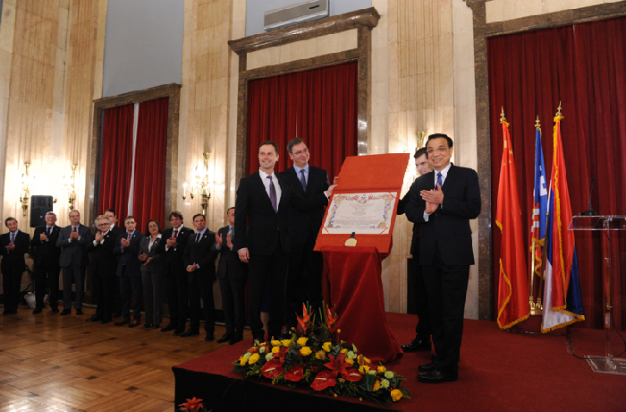 李克強(qiáng)被授予貝爾格萊德榮譽(yù)市民。新華社 饒愛民 攝
