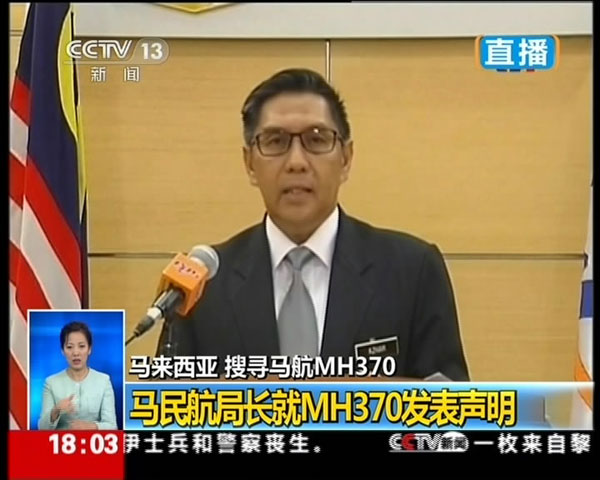 ??? 1月29日,馬來西亞民航局宣布,馬航370航班失事,并推定機(jī)上所有239名乘客和機(jī)組人員已遇難。這是馬來西亞民航局總監(jiān)愛茲哈爾丁發(fā)表講話的視頻截圖。新華社發(fā)