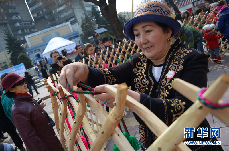 ????4月4日、5日,在阿拉木圖舉辦首界氈房節(jié)。穿著民族服裝的民間藝人搭起具有悠久傳統(tǒng)的哈薩克氈房。氈房上部為穹形,下部為圓柱形,四壁有網(wǎng)狀的木桿搭成整個氈房的骨架,外包白氈。氈房里四周是掛毯,地上是花氈地毯,上面刺著各種圖案,令人賞心悅目。哈薩克斯坦舉辦這次活動是為了將哈薩克氈房列入世界非物質(zhì)文化遺產(chǎn)名錄。(文/盧敬利 圖/葉蓮娜)