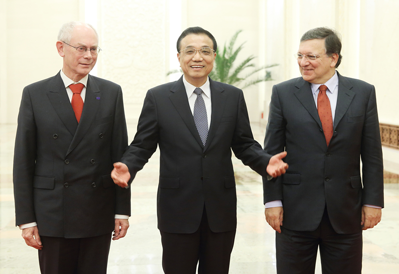 2013年11月21日,國(guó)務(wù)院總理李克強(qiáng)在北京人民大會(huì)堂同歐洲理事會(huì)主席范龍佩、歐盟委員會(huì)主席巴羅佐共同主持第十六次中國(guó)歐盟領(lǐng)導(dǎo)人會(huì)晤。(新華社記者姚大偉攝)