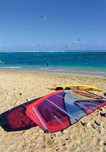 我們?cè)诹裟嵬膸滋鞎r(shí)間里風(fēng)浪都比較大,不過(guò)來(lái)到海邊卻發(fā)現(xiàn)海灘上依舊人聲鼎沸,原來(lái)好動(dòng)的法國(guó)人和一些歐美游客正利用風(fēng)浪玩起了刺激的海上運(yùn)動(dòng)。幾米高的海浪中早已有了十多名沖浪好手相繼嘗試挑戰(zhàn),雖然他們中的大部分只是業(yè)余愛(ài)好,并非職業(yè)沖浪選手,不過(guò)一招一式也是頗為認(rèn)真??拷0陡浇臏\水區(qū)則更多是風(fēng)帆、摩托艇、皮劃艇、海浪滑板等各項(xiàng)水上運(yùn)動(dòng)的世界,對(duì)于他們來(lái)說(shuō),大風(fēng)就是運(yùn)動(dòng)的動(dòng)力,海水就是運(yùn)動(dòng)的場(chǎng)地。一般島上的家庭都會(huì)趁著周末舉家開車來(lái)到海邊,喜歡玩水的玩水,而其他家庭成員則在沙灘上聚餐或者聊天,如此融入大自然真是瀟灑。