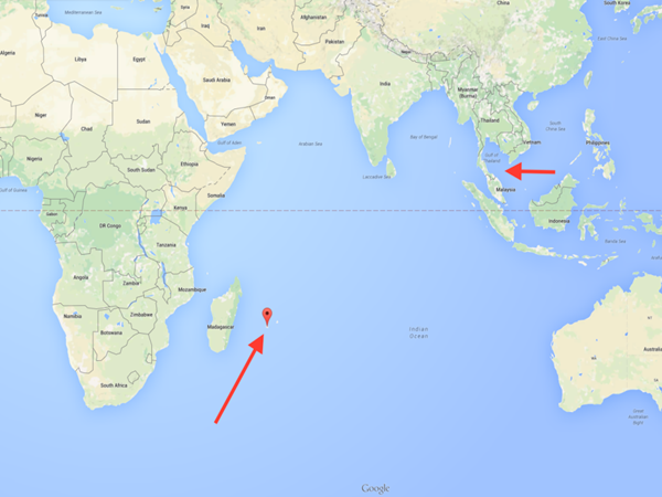 (左側(cè)箭頭是殘骸發(fā)現(xiàn)地,右側(cè)為MH370最后信號的發(fā)出地)