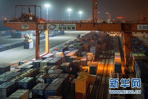 10月15日凌晨,在重慶鐵路口岸中鐵聯(lián)集重慶集裝箱中心站的作業(yè)區(qū),幾臺(tái)大型門(mén)吊在緊張地作業(yè),為第1000列中歐班列裝載出口到歐洲的貨物。當(dāng)日11時(shí)45分,載著筆記本電腦等51個(gè)集裝箱貨物的中歐班列,緩緩駛出重慶團(tuán)結(jié)村站,駛向1.1萬(wàn)公里之外的德國(guó)杜伊斯堡。這是第1000列往來(lái)中國(guó)和歐洲之間的國(guó)際貨運(yùn)列車(chē)。新華社記者劉潺攝