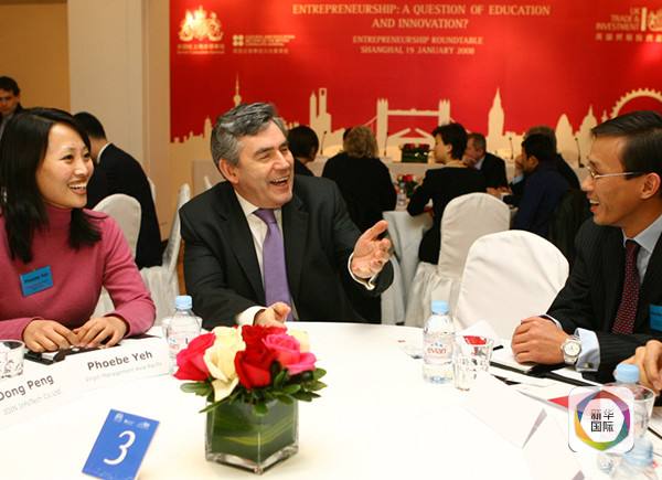 ????2008年1月19日,英國首相布朗(中)在上海與中國企業(yè)家座談。