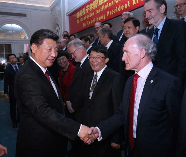習(xí)近平指出,近年來(lái),孔子學(xué)院在英國(guó)快速發(fā)展。目前,英國(guó)已經(jīng)建立起29所孔子學(xué)院和126個(gè)孔子課堂,數(shù)量居歐洲之首。全英孔子學(xué)院取得的碩果也是中英人文交流蓬勃發(fā)展的縮影。通過(guò)人文交流,中英兩國(guó)文化中的精華正在對(duì)兩國(guó)人民的思維方式和生活方式產(chǎn)生著奇妙的“化學(xué)反應(yīng)”?!盀橹粎?,誨人不倦?!毕M谧魑唤處熢俳釉賲?,為中英友好事業(yè)添磚加瓦。希望孔子學(xué)院繼續(xù)秉承“相互尊重、友好協(xié)商、平等互利”的校訓(xùn),為傳播文化、溝通心靈、促進(jìn)世界文明多樣性作出新的更大貢獻(xiàn)。