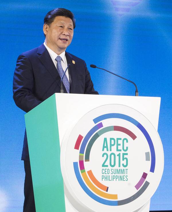 2015年11月18日,國家主席習(xí)近平在菲律賓馬尼拉出席亞太經(jīng)合組織工商領(lǐng)導(dǎo)人峰會并發(fā)表主旨演講。