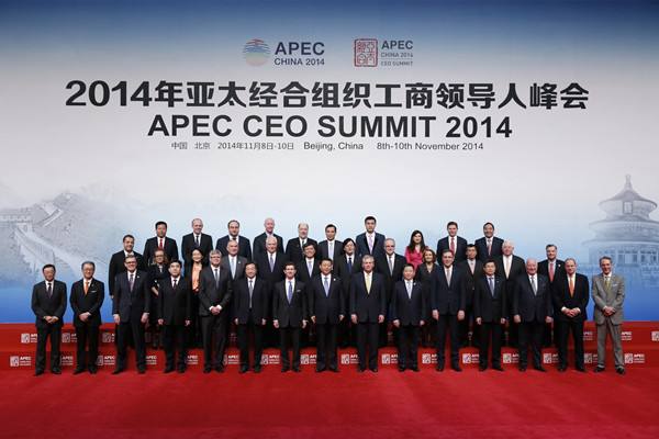 2014年11月9日,國家主席習(xí)近平同與會亞太工商界代表合影。