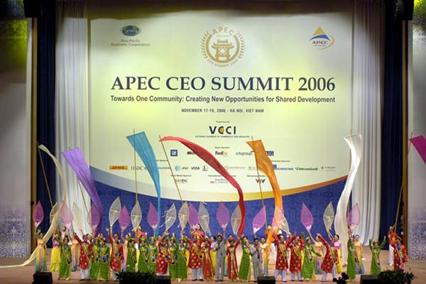2006年11月17日,演員們在越南首都河內(nèi)舉行的2006年APEC工商領(lǐng)導(dǎo)人峰會開幕式上表演。