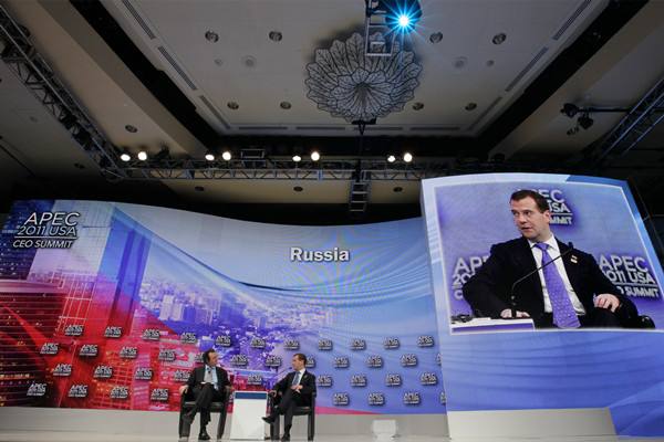 2011年11月13日,俄羅斯總統(tǒng)梅德韋杰夫出席在美國夏威夷州首府檀香山舉行的APEC工商領(lǐng)導(dǎo)人峰會。