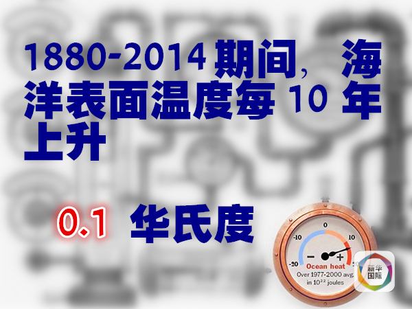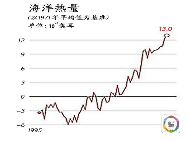 據(jù)美國獨立機構氣候總站統(tǒng)計,從1880年到2014年,海洋表面溫度每10年平均升高0.1華氏度。如果按照海洋儲存熱量的變化來看,以10的22次方焦耳為單位、1971年為基準,1955年海洋儲存熱量在負3個單位以下,2014年則超過13個單位。