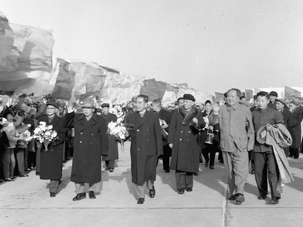 1964年3月15日,國務(wù)院總理周恩來結(jié)束了對非洲10個國家、阿爾巴尼亞和亞洲3個國家的訪問之后,乘專機回京。黨和國家領(lǐng)導(dǎo)人毛澤東、劉少奇、鄧小平等以及首都各界群眾五千多人前往機場熱烈歡迎。(新華社記者劉慶瑞攝)