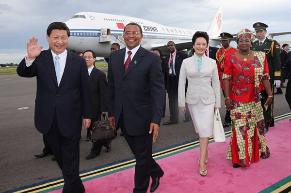 圖為2013年3月24日,國家主席習(xí)近平乘專機抵達(dá)達(dá)累斯薩拉姆尼雷爾國際機場,開始對坦桑尼亞進(jìn)行國事訪問。坦桑尼亞總統(tǒng)基奎特和夫人到機場迎接習(xí)近平和夫人彭麗媛。(新華社記者 蘭紅光攝)