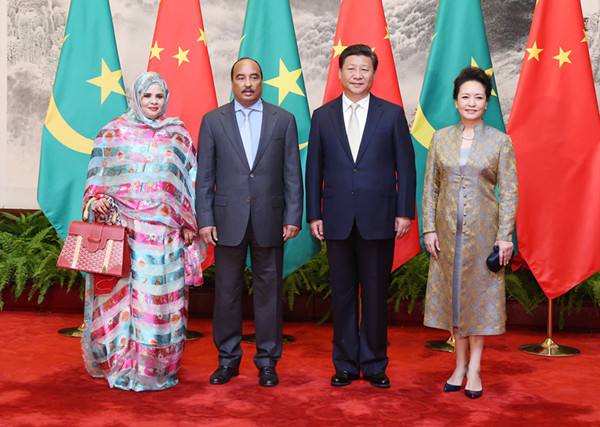 2015年9月14日,習(xí)近平舉行儀式歡迎毛里塔尼亞總統(tǒng)阿齊茲訪華。這是習(xí)近平主席和夫人彭麗媛在人民大會堂同阿齊茲總統(tǒng)夫婦合影。(新華社記者姚大偉攝)