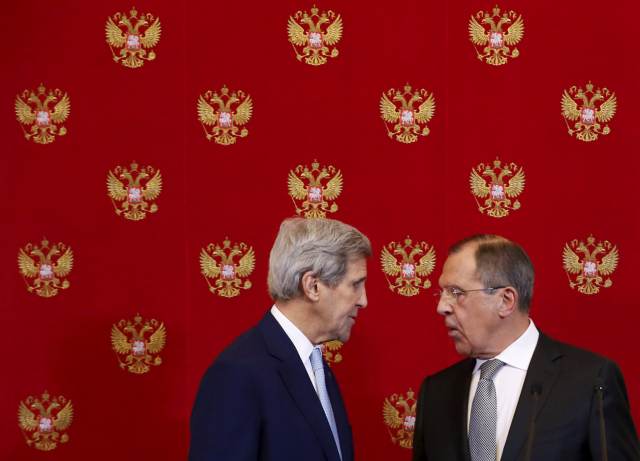 2015年12月15日,俄羅斯外長拉夫羅夫(右)同美國國務(wù)卿克里在莫斯科克里姆林宮出席記者會。 新華社/路透