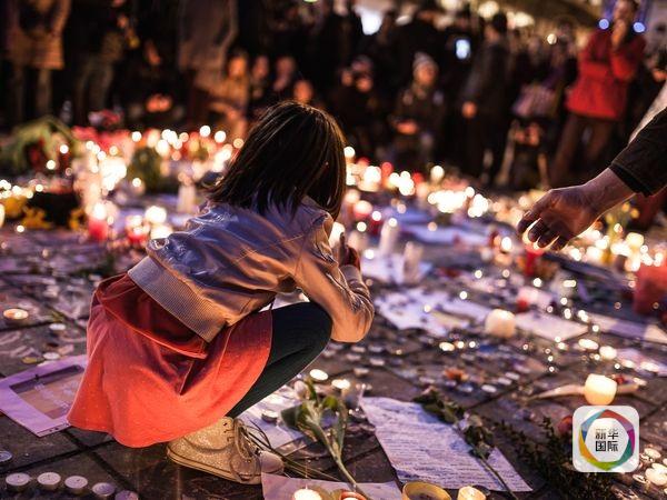 布魯塞爾市中心廣場,女孩點(diǎn)燃悼念蠟燭。(圖片來源:新華/美聯(lián))