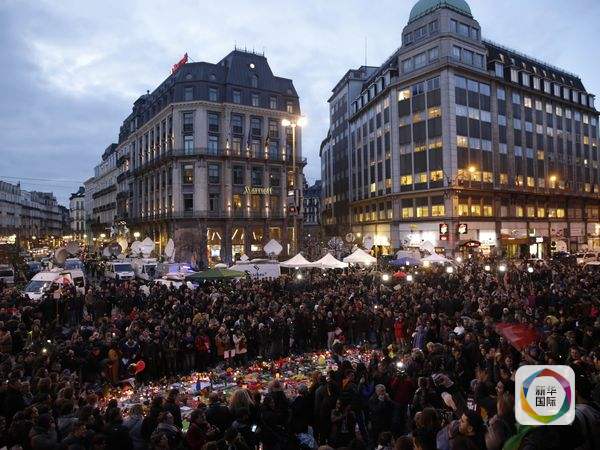 布魯塞爾,數(shù)百民眾圍聚在廣場上,悼念恐襲遇難者。(圖片來源:新華/法新)