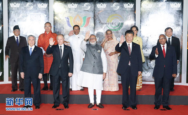 10月16日,金磚國家領導人同“環(huán)孟加拉灣多領域經濟技術合作倡議”成員國領導人對話會在印度果阿舉行。國家主席習近平同印度總理莫迪、南非總統(tǒng)祖馬、巴西總統(tǒng)特梅爾、俄羅斯總統(tǒng)普京以及斯里蘭卡總統(tǒng)西里塞納、孟加拉國總理哈西娜、不丹首相托杰、尼泊爾總理普拉昌達、緬甸國務資政昂山素季、泰國政府代表等共同出席。這是與會領導人合影。新華社記者姚大偉攝