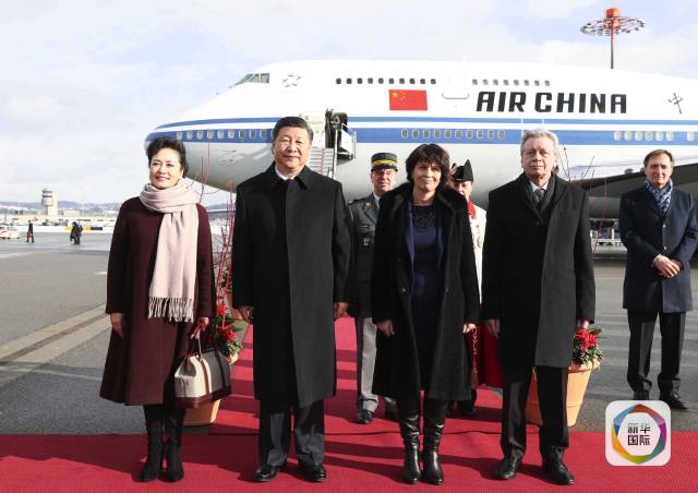 1月15日,國(guó)家主席習(xí)近平乘專(zhuān)機(jī)抵達(dá)蘇黎世,開(kāi)始對(duì)瑞士聯(lián)邦進(jìn)行國(guó)事訪(fǎng)問(wèn)。這是瑞士聯(lián)邦主席洛伊特哈德在機(jī)場(chǎng)為習(xí)近平和夫人彭麗媛舉行隆重歡迎儀式。(新華社記者蘭紅光攝)