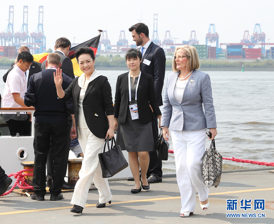 當?shù)貢r間7月7日上午,應德國總理默克爾丈夫紹爾邀請,國家主席習近平夫人彭麗媛同出席二十國集團領導人第十二次峰會的部分代表團團長配偶乘船參觀漢堡港。新華社記者 王曄 攝
