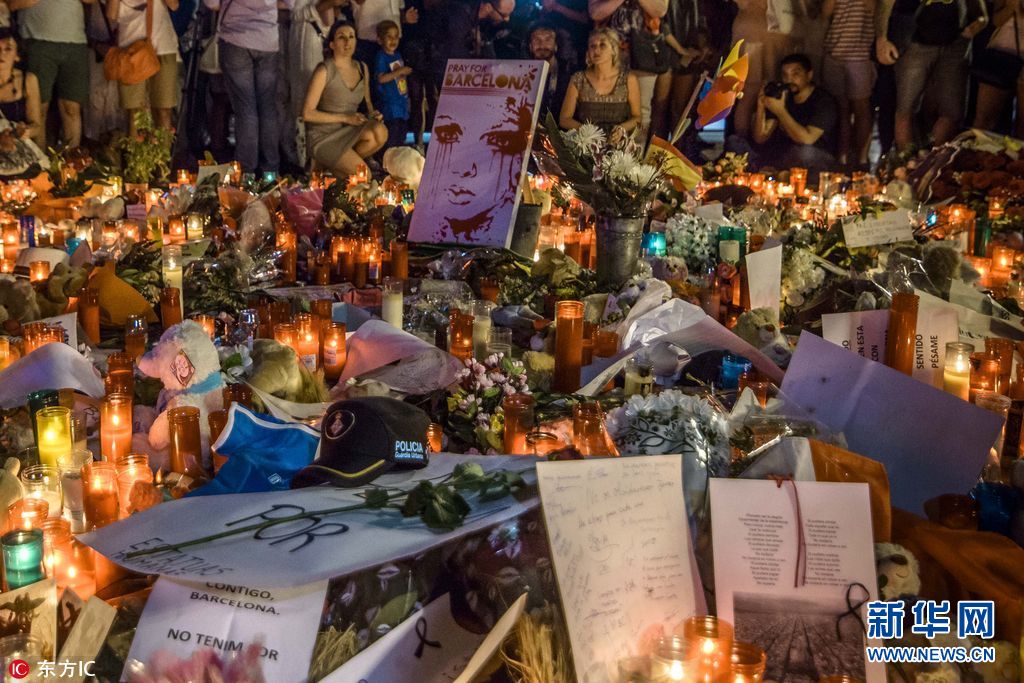 當(dāng)?shù)貢r間2017年8月18日,西班牙巴塞羅那,當(dāng)?shù)孛癖婞c燭獻花悼念恐襲事件遇難者。17日,一輛白色貨車在巴塞羅那市中心蘭布拉大道加泰羅尼亞廣場附近沖撞人群,據(jù)媒體報道,死亡人數(shù)已經(jīng)升至14人。(圖片來源:東方IC)