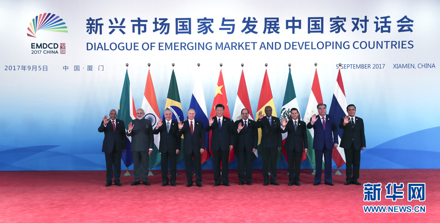 9月5日,國(guó)家主席習(xí)近平在廈門國(guó)際會(huì)議中心主持新興市場(chǎng)國(guó)家與發(fā)展中國(guó)家對(duì)話會(huì)并發(fā)表重要講話。金磚國(guó)家領(lǐng)導(dǎo)人巴西總統(tǒng)特梅爾、俄羅斯總統(tǒng)普京、印度總理莫迪、南非總統(tǒng)祖馬和對(duì)話會(huì)受邀國(guó)領(lǐng)導(dǎo)人埃及總統(tǒng)塞西、幾內(nèi)亞總統(tǒng)孔戴、墨西哥總統(tǒng)培尼亞、塔吉克斯坦總統(tǒng)拉赫蒙、泰國(guó)總理巴育出席對(duì)話會(huì)。這是對(duì)話會(huì)前,習(xí)近平同出席對(duì)話會(huì)的各國(guó)領(lǐng)導(dǎo)人集體合影。