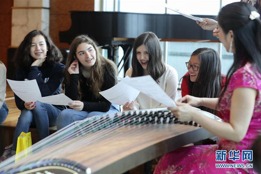 2017年5月5日,在中國駐美國紐約總領(lǐng)館舉行的“感知中國”活動中,一名老師為美國學(xué)生展示古箏彈奏。新華社記者王迎攝